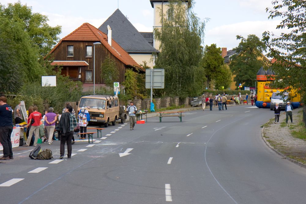 Auf der Gegenveranstaltung sind mittlerweile die ersten Sitzblockaden errichtet, manche mit solchem Erfolg, dass die Polizei einige Nazis wieder nach Hause schicken muss. Das bürgerliche Pendant zu den Sitzblockaden ist die Pößnecker „Meile der Demokratie“. Hier hat sich das Who’s who der Thüringer Landespolitik versammelt, ruft zum Gesicht zeigen und deutlichem Protest auf, auch wenn die „Meile“ hunderte Meter entfernt vom Veranstaltungsort der Nazis liegt und die wenigen Zuhörer eher mit ihren Bierbechern und Bratwürsten zu kämpfen haben.